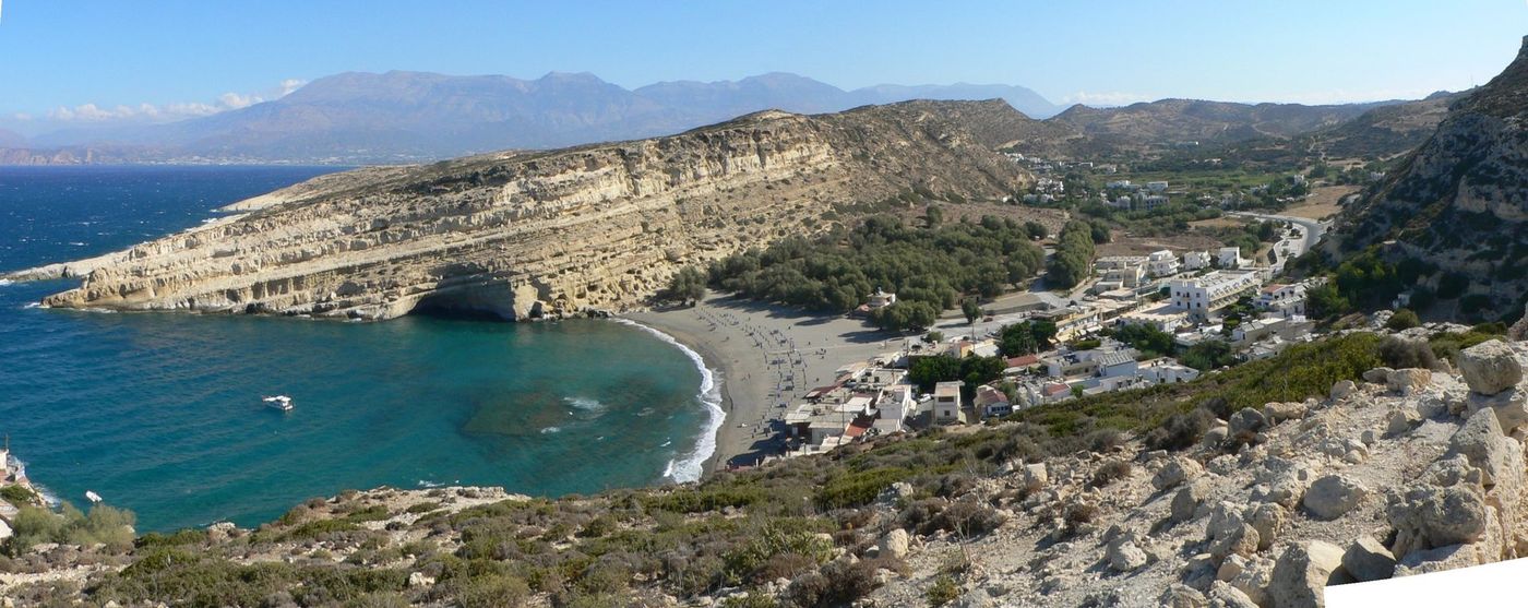 Matala liegt an der sonnigen Südküste Kretas und trägt eine besondere Magie in sich. Die berühmten Höhlen, die sich wie natürliche Kunstwerke in die Felswand schmiegen, erzählen Geschichten aus längst vergangenen Zeiten – und aus der Hippie‑Ära, die Matala zu einem Symbol von Freiheit und Lebensfreude machte.